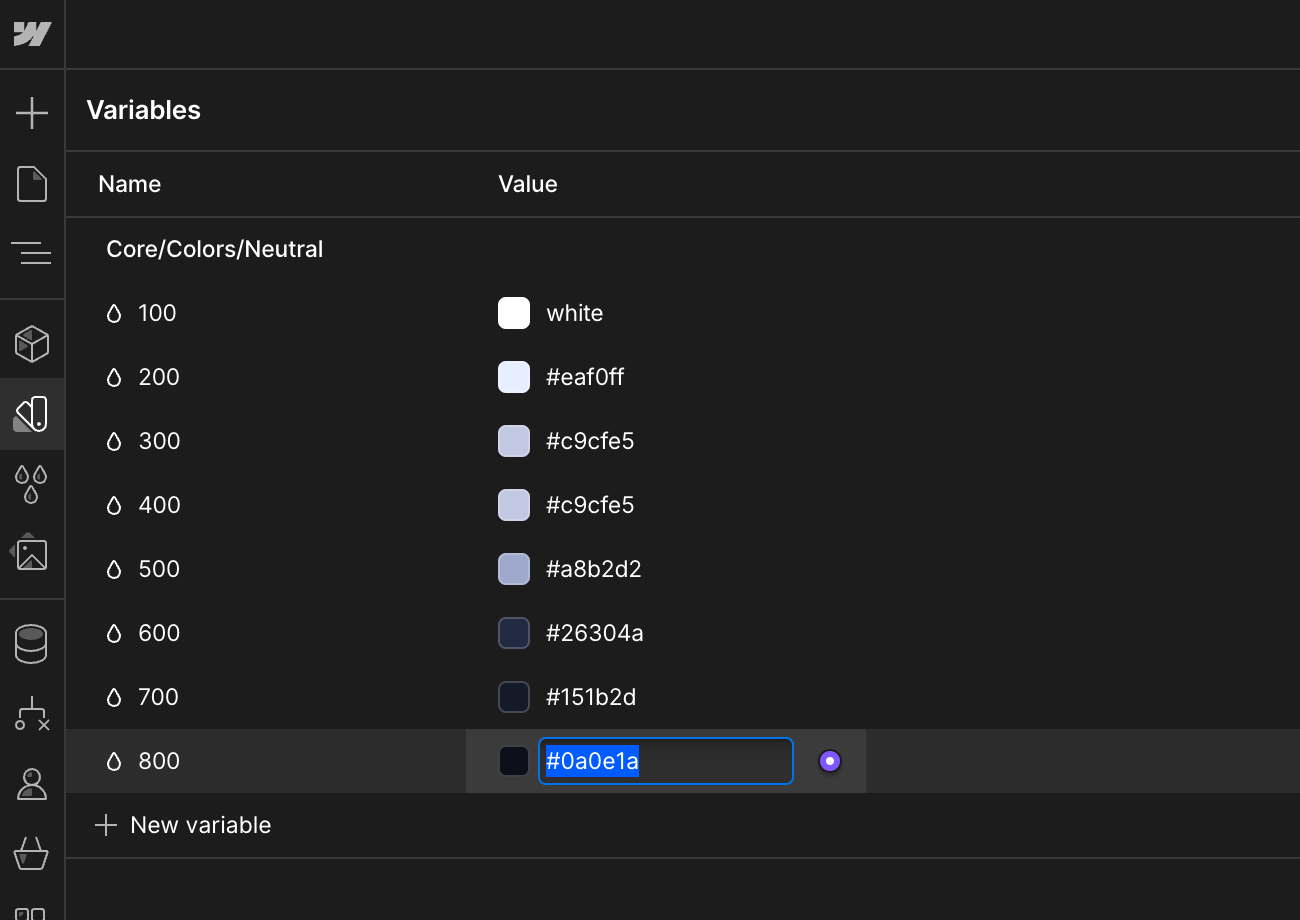 In order to do this, you just need to go to the Variables tab in the left sidebar, then scroll to Colors, and if you double click the color, you will be able to edit them to be updated site-wide to any color needed.